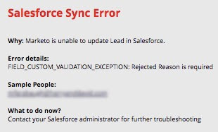 When Marketo attempts to send data values that do not conform to the validation rules set up in SFDC, a sync error shows up. All fields will be synced except the field that does not meet SFDC's expectations.